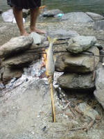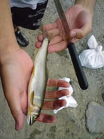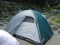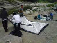 いやーのどかなトコやねぇ(´Д`) で、目的地到着!電波がスゲー悪い それにしてもギガント水質が良杉wwww お魚さんがいっぱい見えるんすけど(゚∀゚)wkwk 早速テントを建てる 写真では分からないけど、実は川から3メートル位しか離れてないんすよね 立地条件上、こうするしかなかった(´∀`∩;) 増水したら洒落にならんぞwww そしてテントを建てた後に泳ぐ俺達! 鮎、ヤマメ、オイカワ、ウグイがいる(゚∀゚) 早速、はしねこが持ってきたヤスで形が良い鮎を狙う!! が、あまりにも速すぎる為に突けず_| ̄|○ 3時間くらい潜っても駄目だったが石村がやってくれた! 取れだちを早速塩焼に! びひゃああ美味いぃいい(゚∀、゚)ノ 蟹さんも捕まえたので塩茹でて喰う!! これは蟹よりも海老に近い感じで…美味! キャンプ最高やなー^^